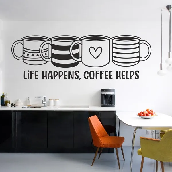 Wall sticker life happens, coffee helps. Design featuring four breakfast cups alongside the English phrase: “Life happens, coffee helps.” This design is ideal for those who appreciate the warmth of coffee and seek daily inspiration. This vinyl is not just a decoration; it’s a statement of lifestyle. You can customize it in different sizes and colors to perfectly fit your space.